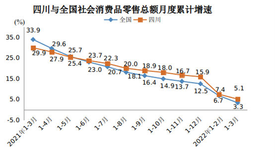 (二)消费品市场运行情况明显不及预期。一季度,四川消费市场在两轮散发疫情冲击下,实现社会消费品零售总额5917.0亿元,同比仅增长5.1%,远低于正常年景增长水平。与全年增长8.0%的目标任务还有较大差距,要完成全年目标任务,需后三季度平均增长9%左右。同时,四川增速虽在全国排名第7位,但这是在去年一季度低于全国4.0个百分点的基础上实现的,也仅比受东部较大疫情影响明显拉低的全国平均水平快1.8个百分点,表明四川消费品市场运行较去年承压更加明显。